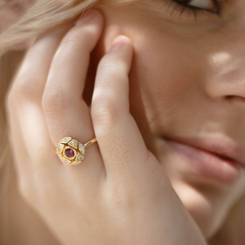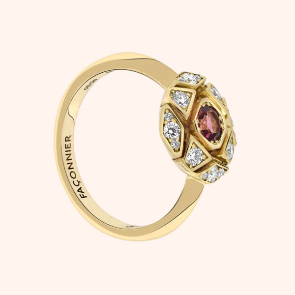 The 18-carat yellow gold was chosen for its warmth and luminosity, reminiscent of the sun's rays reflecting on the water. The 16 brilliant diamonds, meanwhile, evoke the twinkling stars in the night sky. But the real heart of this ring is the dazzling pink tourmaline, 4 mm in diameter and weighing 0.25 carats.