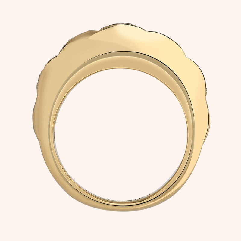 The Megève ring is a stunning and elegant piece of jewelry. It is crafted in radiant yellow gold and sparkling diamonds. Yellow gold and diamonds have always been a perfect combination, combining the rich, warm tones of yellow gold with the brilliance of diamonds. The ring is unique thanks to its original design with its many curves on the top and sides. The many diamonds represent the eternal snow of the summits. It is very elegant and makes an excellent addition to any jewelry collection.