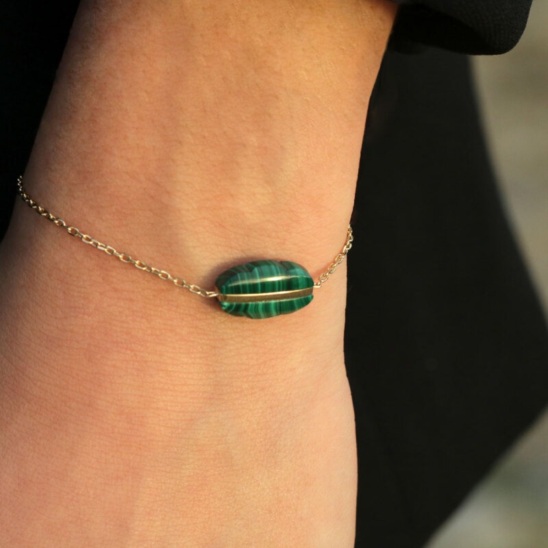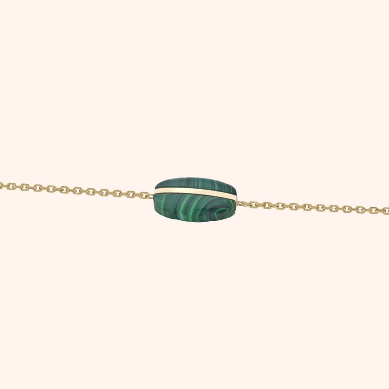 A yellow gold and malachite bracelet is a stunning piece of jewelry that combines the warmth and richness of yellow gold with the vibrant green hues of malachite. The stone is cut and polished to highlight its natural patterns and variations. The natural patterns and variations of the stone make each piece unique and reflect the Auvergne-Rhône-Alpes region with its many mountainous reliefs. This bracelet is a perfect choice for those who love the elegance and luxury of yellow gold.