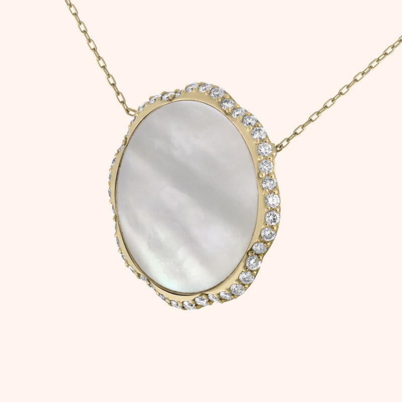 This yellow gold necklace features an 18 mm round mother-of-pearl pendant, surrounded by sparkling 0.48 carat GSI-quality diamonds. The mother-of-pearl adds a touch of natural beauty, while the diamonds add a touch of luxury and sparkle. Yellow gold adds a warm, rich tone to the overall design. This 3.36-gram necklace is sure to add sparkle this summer season.