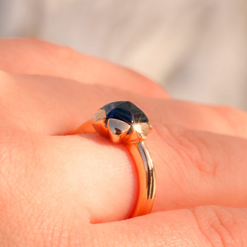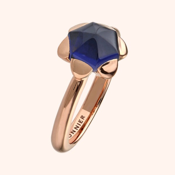 « Dans cette collection, nous avons choisi de travailler la Iolite. La Iolite est une pierre d’un bleu magnifique et vibrant qui représente parfaitement la couleur de l’iris. Nous avons choisi de tailler les pierres sur-mesure en «  »hexagone étoilé » » de 8 mm pour ajouter une touche supplémentaire d’unicité à la collection. Les pétales en or rose 18 carats de 6,27 grammes se marient parfaitement à la couleur de la iolite. Le résultat est une pièce vraiment unique qui sera certainement chérie pendant des années. »