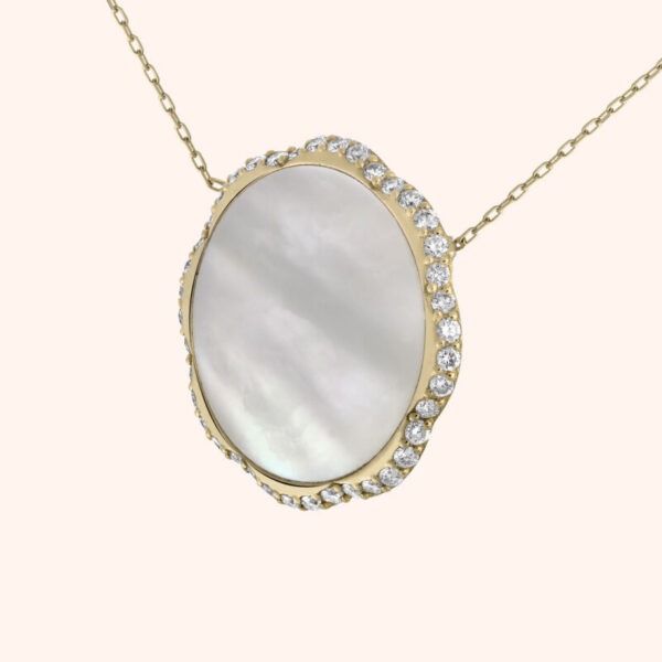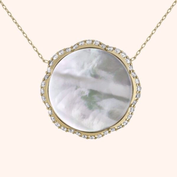 Ce collier en or jaune présente un pendentif rond en nacre de 18 mm, entouré de diamants étincelants de 0,48 carat de qualité GSI. La nacre apporte une touche de beauté naturelle, tandis que les diamants ajoutent une touche de luxe et d’éclat. L’or jaune ajoute un ton chaud et riche à l’ensemble du design. Ce collier de 3,36 grammes apportera de l’éclat en cette période d’été.
